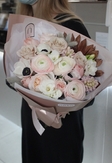 На фото букет з у розмірі S+. Ви маєте можливість обрати бажаний розмір. Букет може мати відмінності на 10-15%, в залежності від сезона. Перед відправкою наші флористи надішлють вам фото для підтвердження замовлення. ⠀ Доставка по Києву здійснюється день в день або в обраний вами день нашим кур'єром. ♡